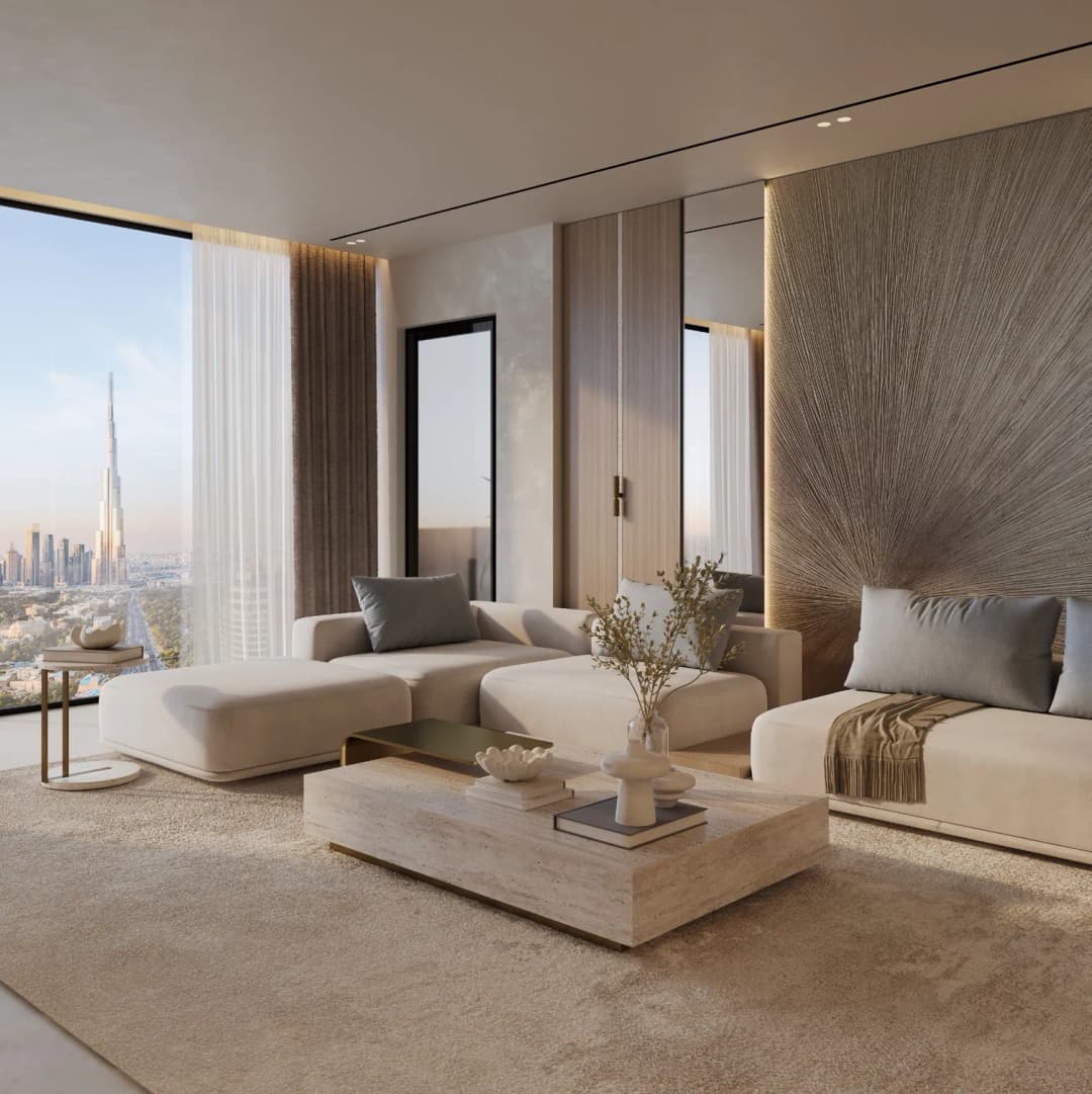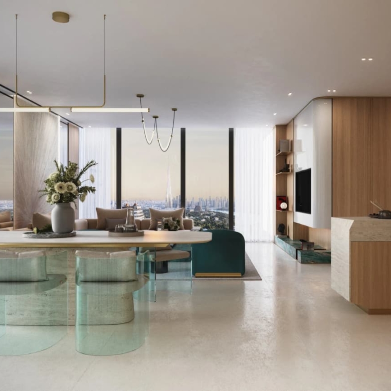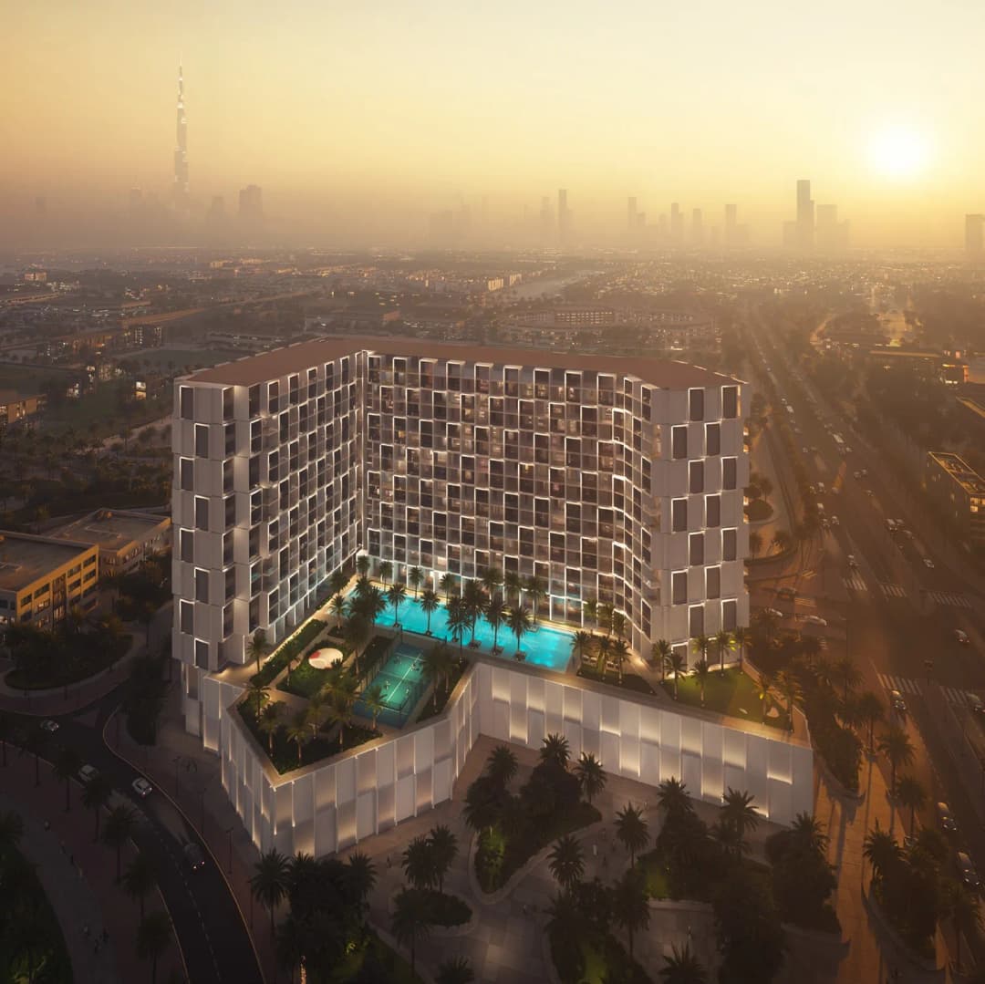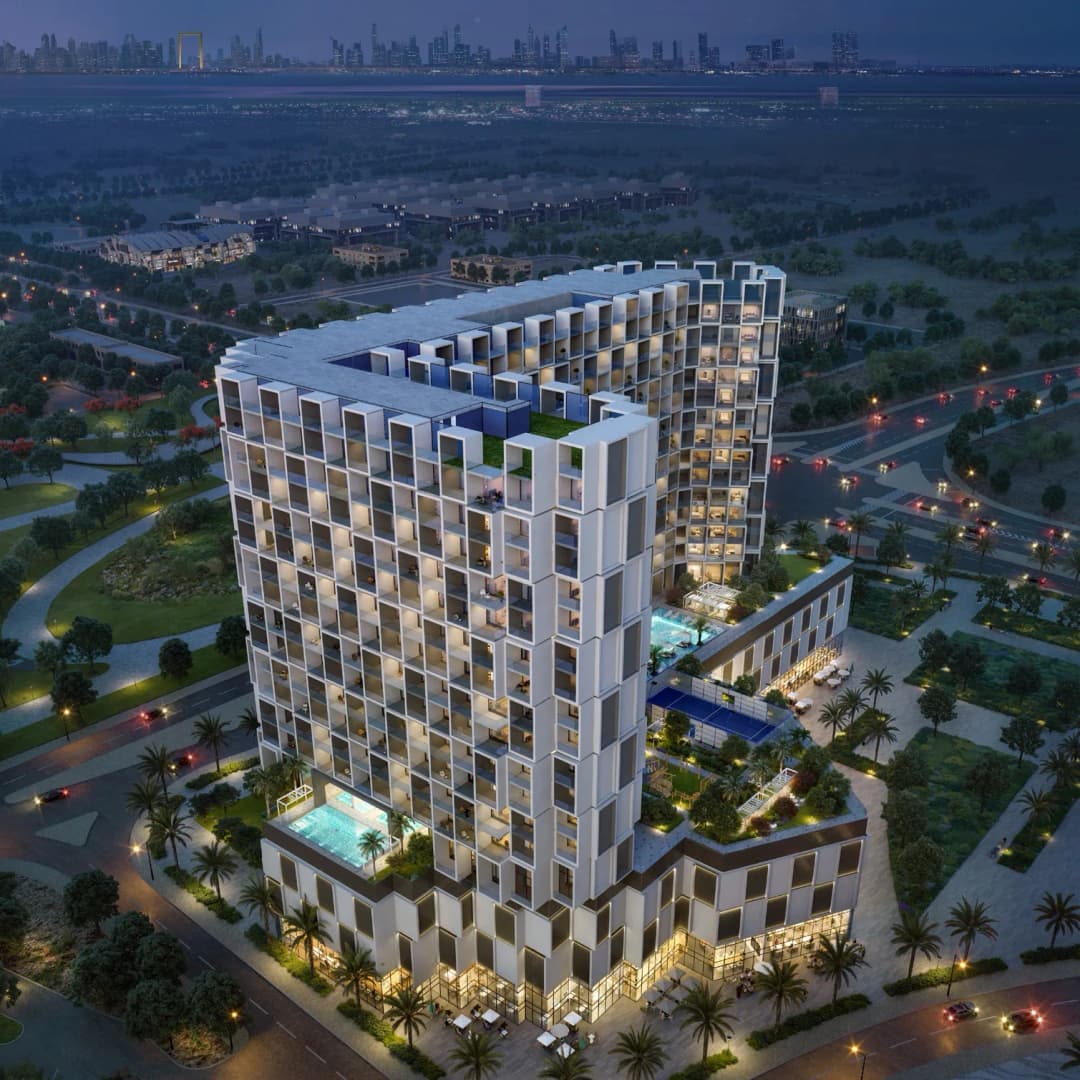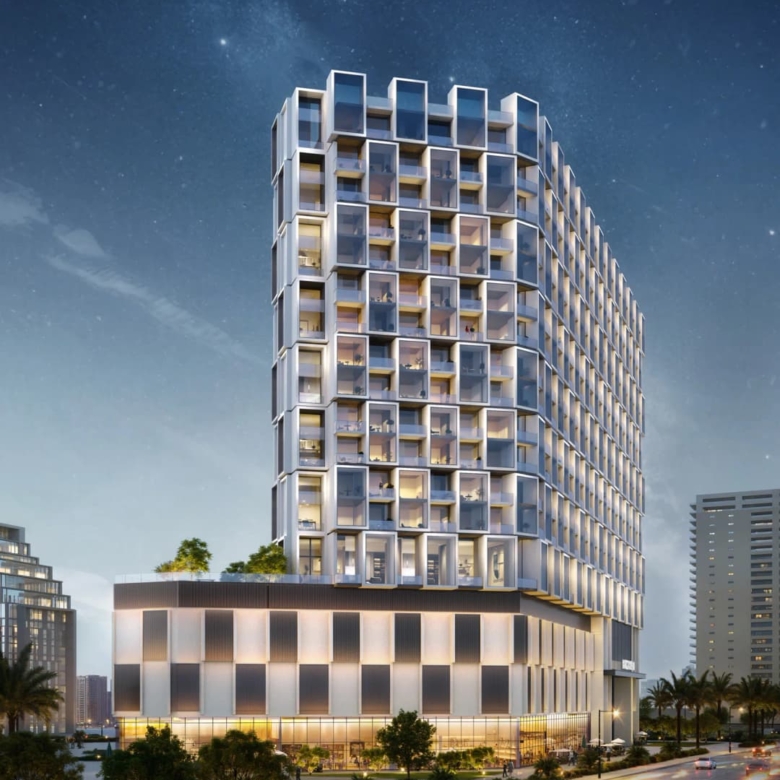 The architecture of the complex is defined by Binghatti’s signature clean lines and geometric forms, creating a modern, recognizable silhouette that blends harmoniously with the surrounding landscape. The interiors are designed in a contemporary style, utilizing high-quality materials to ensure a luxurious and comfortable living experience.