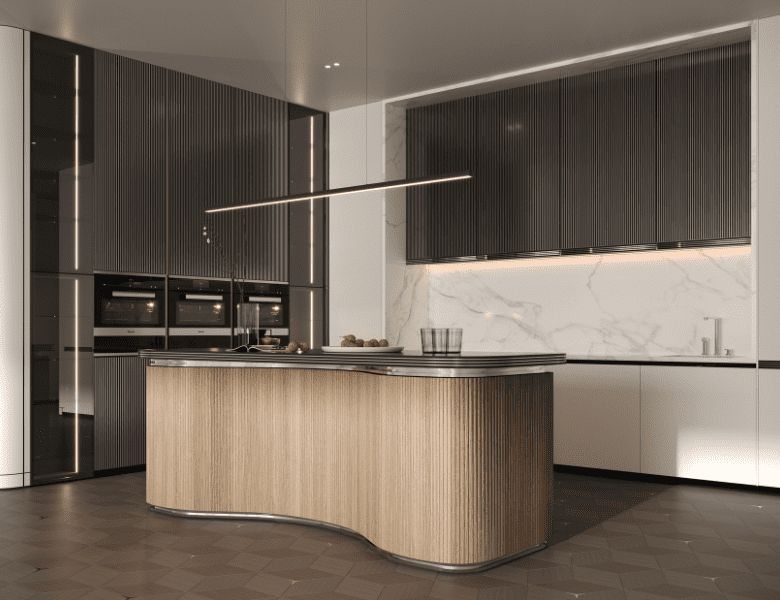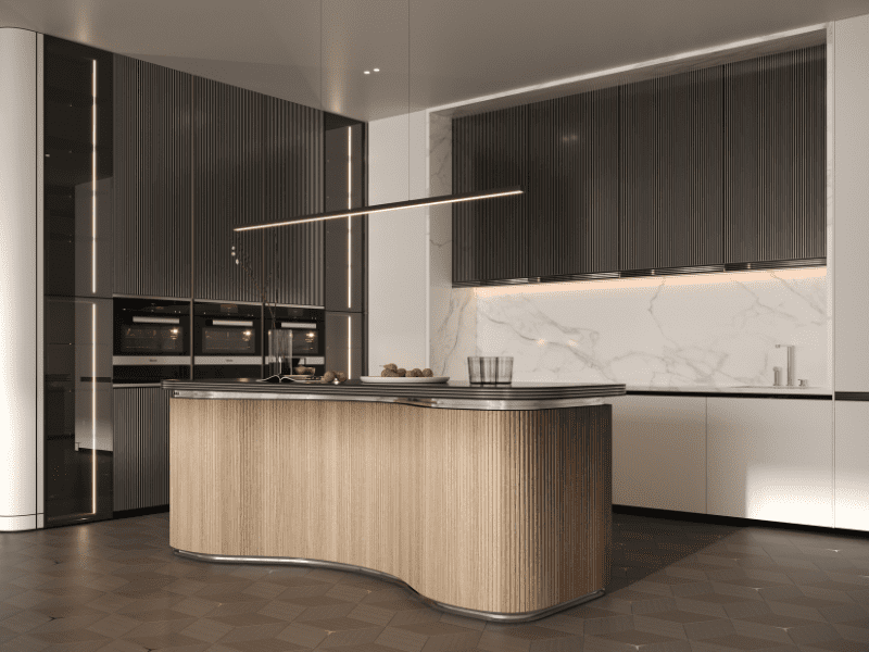 • Fully equipped with premium integrated appliances, marble countertops, and chrome accents inspired by Mercedes-Benz automotive design.