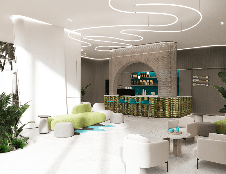Work & Social: Professional co-working zones and a floating lounge for residents.